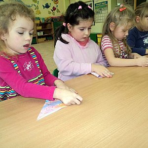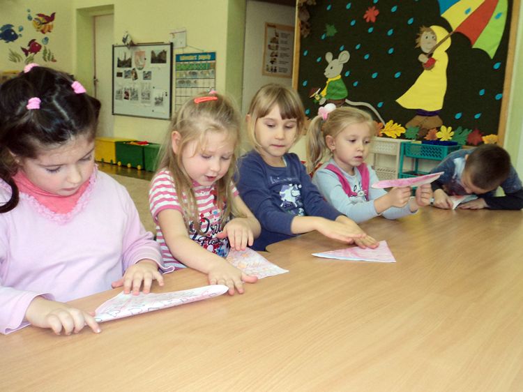 W grupie Tygryski, w Samorządowym Przedszkolu nr 2 w Szubinie cyklicznie podejmują wspólnie mozolną pracę techniką origami. Dzieci wiedzą, że podczas składania papieru obowiązują reguły: należy zawsze składać na powierzchni stołu, składają dwie ręce, zgięcia prasujemy od środka figury składanej do jej krawędzi, składamy tylko tyle elementów, ile potrzeba do ułożenia wzoru lub kompozycji własnego pomysłu, w kompozycji na jednej kartce papieru stosujemy tylko jeden rodzaj figur, każde składanie kończy się powodzeniem (kompozycja płaska lub przestrzenna). Japońska sztuka składania papieru rozwija u dzieci pięcioletnich koncentrację wzrokowo - ruchową, sprawność manualną, pamięć i uwagę a także umiejętności współdziałania w grupie. Origami pobudza układ nerwowy, integrując w czasie składania papieru pracę obu półkul mózgowych. Dzięki temu dziecko odbiera wrażenia, angażując wszystkie możliwe zmysły. Sztuka origami w edukacji przedszkolnej pełni także funkcję terapeutyczną: uspokaja, wycisza dzieci nadpobudliwe, jest formą wspierania rozwoju dzieci. Jednocześnie pomaga rozwijać pojęcia matematyczne, określając przy tym wielkość, nazywając figury geometryczne oraz ucząc logicznego myślenia. Zajęcia z origami budują poczucie własnej wartości wśród dzieci, jego samodzielności i dążenie do samorealizacji. Sztuka origami pozwala odkrywać talenty, zdolności i zainteresowania dzieci. Motywuje do dalszej pracy, a także uczy dyscypliny. Origami cieszy się dużym zainteresowaniem Tygrysków, ponieważ sprawia im radość i daje satysfakcję z wykonanej pracy.