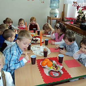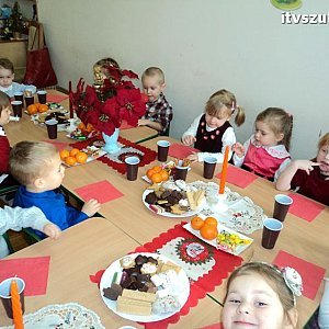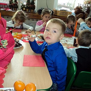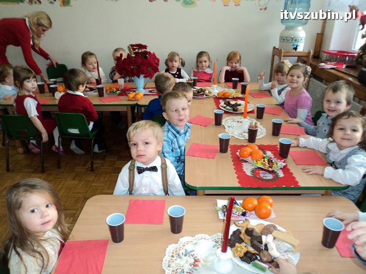 21 grudnia 2012 r. w Samorządowy Przedszkolu nr 2 w Szubinie, Wigilia - jest nastrój, choinka, mnóstwo uśmiechniętych buziek wyczekujących niesamowitego gościa i ta wiara, że On naprawdę istnieje. Już od samego rana można rozpoznać było, że to nie jest zwykły, codzienny dzień, ale jeden z tych wyjątkowych!!! Dzieci od samego rana odświętnie ubrane,nastrój we wszystkich salach i kolędy śpiewane przy choince. Również w grupie Smerfy - jasełka, kolędy, dzielenie się opłatkiem, uśmiech, radość ze spotkania z gwiazdorem upragnionym i oczekiwanym przez Smerfiki dwu, trzy i czteroletnie. Rodzice zadbali o prezenty, które wręczał gwiazdor Krystian Maludziński, tata dwuletniego Wiktorka. Do wspólnych przeżyć jak zawsze włączyła się nieoceniona i niesamowita grupa młodzieży z LO pod kierunkiem Pani Bernadety Kowalskiej. Rolę wesołych gwiazdorów w innych grupach wcielili się Sebastian Rygielski i Paweł Baczyński, chłopcy specjalnie przyjechali do nas na świąteczne spotkanie oraz śnieżynki Jagoda Hek i Kamila Kilkowska. Reniferami zajechał do nas również gwiazdor gminy Artur Krajewski. Tego roku swoją obecnością ubogaciły nas gwiazdory i sprawiły dzieciom wielką frajdę. Dzieci odwdzięczyły się Gwiazdorowi piosenkami, wierszami a odważni nawet uściskiem i buziakiem.