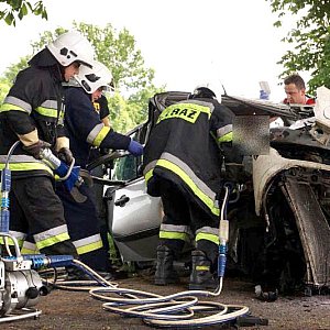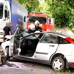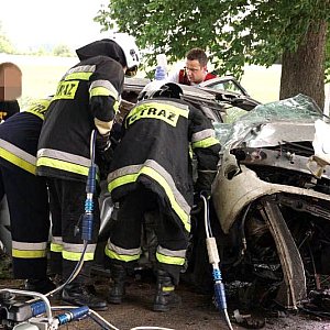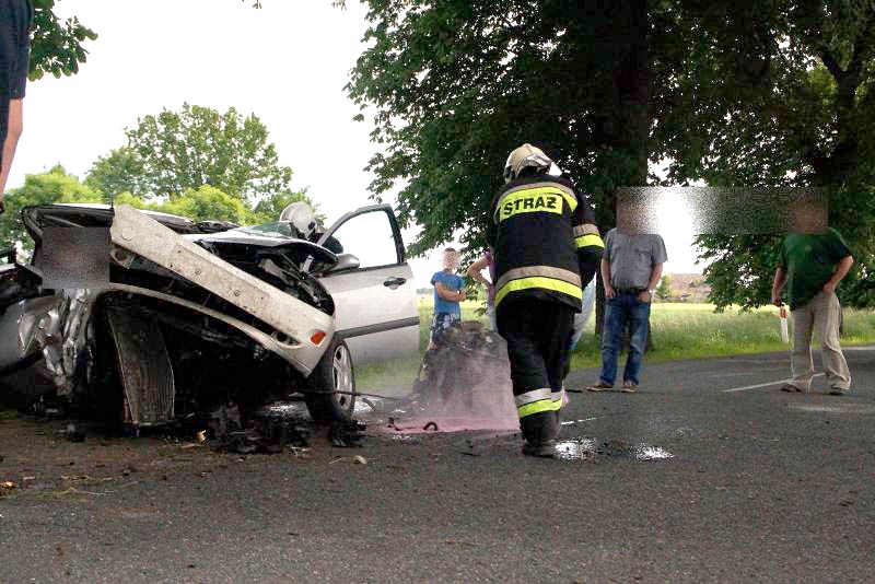 FORD FOCUS, jadący w kierunku Poznania, podczas manewru wyprzedzania samochodu ciężarowego z naczepą, zjechał z lewej krawędzi jezdni i uderzył w drzewo. Wszystko działo się na moich oczach, fokus wyprzedził mnie i po chwili uderzył w drzewo. Silnik wyskoczył z samochodu, a auto zostało mocno rozbite. - relacjonował zdarzenie naszej redakcji kierowca wyprzedzanej ciężarówki. Kierowca tzw. Tira wraz z innym kierowcą wezwali pomoc i sami próbowali wydostać z rozbitego auta pasażera, który jak później się okazało miał przygniecione nogi. Na miejscu zdarzenia pracowali ratownicy medyczni i strażacy z Kcyni. Po chwili dojechał zastęp z Jednostki Ratowniczo-Gaśniczej nr 2 w Szubinie oraz druga karetka z Szubina. Akcja należała do trudnych, gdyż sytuacja jaką zastali ratownicy wymagała użycia profesjonalnego sprzętu pneumatycznego do wycinania stali i metalu. W czasie gdy strażacy wycinali drzwi i konstrukcję auta, ratownicy medyczni wewnątrz i na zewnątrz rozbitego samochodu udzielali pomocy pasażerowi. Przebieg akcji mimo bardzo szybkiego tempa i odważnych decyzji wymagał czasu. Strażacy do wydostania poszkodowanej osoby musieli użyć rozpieraka pneumatycznego, który skutecznie rozszerzył zmiażdżoną konstrukcję pojazdu. Strażacy z kcyńskiej ochotniczej straży znakomicie współpracowali z ratownikami medycznymi, pomagali im podawać leki poprzez kroplówki oraz tlen. Poszkodowanego do szpitala w Bydgoszczy przetransportowało Lotnicze Pogotowie z Bydgoszczy. W całym zdarzeniu kierowca rozbitego samochodu osobowego nie odniósł większych obrażeń. Przy wypadku od pierwszych chwil pracowali także policjanci z komisariatu Policji w Kcyni, którzy zostali wsparci technikami kryminalistyki z Komendy Powiatowej Policji w Nakle nad Notecią.