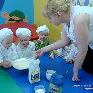 W tym tygodniu w Przedszkolu "Słoneczko" obchodzony był DZIEŃ PIEKARZA. Dzieci miały okazję wcielić się w rolę piekarzy. Poznały charakterystyczne elementy stroju i miejsca pracy dla tego zawodu. Zapoznały się z procesem powstawania pieczywa od samego ziarenka zboża do gotowego produktu. Poznały rodzaje tego przysmaku, a nawet samodzielnie wymieniały wyroby dostępne w piekarni. Każda z grup samodzielnie przygotowała pachnące bułki. Dzieci własnoręcznie wyrabiały ciasto zapoznając się z jego składnikami. 12 marca 2014 r. grupy "Żabki" i "Pszczółki" uczestniczyły w spotkaniu z bardzo oczekiwanym gościem, którym był pan piekarz. Interesująco opowiadał dzieciom o sposobie wypiekania chleba i bułeczek, a także z jakich składników one powstają, pokazał swój strój roboczy, zaprezentował różne rodzaje pieczywa, a przedszkolaki z łatwością potrafiły określić ich kształt, kolor i wielkość. Dzieci z wielkim zaciekawieniem słuchały gościa, który pomógł im przygotować ich własne wypieki. Długo wyczekiwana degustacja wypieków zwieńczyła "pachnący" dzień przedszkolaków. Wszyscy długo pamiętać będą samodzielnie przygotowane smakołyki i rozchodzący się w całym przedszkolu cudowny zapach świeżych bułeczek.