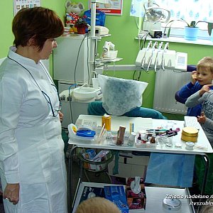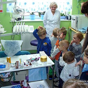 ?Żeby zdrowe zęby mieć trzeba tylko chcieć!". Przedszkolaki z Niepublicznego Przedszkola ?Słoneczko? w Szubinie doskonale o tym wiedzą. Wiedzą także, jak ważne są wizyty u stomatologa. Dlatego też 17 marca 2014 r. wybraliśmy się z wizytą do gabinetu stomatologicznego Pani dr Eleonory Otfinowskiej. Dzieci miały okazję zapoznać się ze specyfiką pracy dentysty oraz obejrzeć wygląd i wyposażenie gabinetu stomatologicznego. Dowiedziały się również jak dbać o ząbki, by były zawsze piękne i zdrowe. Na koniec każdy chętny przedszkolak osobiście przekonał się, na czym polega praca stomatologa - przechodząc kontrolę stanu zdrowia zębów. Dzielne i te mniej dzielne przedszkolaki otrzymały piękne nagrody ? w tym kolorowanki oraz książeczki. Na miejscu okazało się, że czekała nas jeszcze jedna miła niespodzianka. W ?Galerii Korytarzyk? dzięki Pani Paulinie Marchlewskiej czekał na nas niesamowity gość Pan Maciej Jeliński. Opowiedział on naszym przedszkolakom o obrazach, które z wielkim zainteresowaniem oglądały, a także pokrótce o technice jaką zostały wykonane. ?Żabki? z wielkim entuzjazmem wracały do przedszkola, chętne od razu wziąć się za pracę aby stworzyć własne dzieła.
