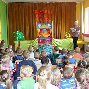 27 marca 2014 r. w Przedszkolu "Słoneczko" w Szubinie obchodzony był Międzynarodowy Dzień Teatru. Z tej właśnie okazji, Panie z przedszkola przygotowały małą niespodziankę dla wszystkich przedszkolaków. Było to kukiełkowe przedstawienie teatralne pt. "Czerwony Kapturek" - w nieco zabawnym stylu. Dzieci, jak "zaczarowane", oglądały inscenizację wpatrzone w bajkowe postaci. Po spektaklu miały też okazję dotknąć pacynek i wcielić się w role. Wszystkim dopisywały wyśmienite humory. Dzieci po raz kolejny przybliżyły się do sztuki. Ten dzień na długo pozostanie w pamięci naszych wychowanków.