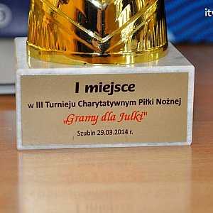 29 marca 2014 r. w Hali Widowiskow-Sportowej w Szubinie przy Szkole Podstawowej nr 1 rozpoczął się III Turniej Charytatywny Piłki Nożnej - Gramy dla Julki. Do wspólnej rywalizacji stanęło dziewięć drużyn: Grupa A: Płonące Strzelby, Gąsawa, MOAS Szubin, Kuantom Szubin, Gazeta Wyborcza; Grupa B: Dziewierzewo, Policja - ZW.NSZZ KWP Bydgoszcz, Daro-Pomoc Drogowa, Oldboys Szubin. Turniej rozgrywany jest systemem grupowym - play off, czas gry 10 min. Wszystkie przybyłych zawodników przywitał Aleksander Andrzejewski wspólnie z tatą i rodziną Julki Iciak. Przed godz. 13.00 odbyła się licytacja gadżetów sportowych, którą poprowadzi Artur Krajewski, na której zebrano ponad 2.000 zł. Poniżej prezentujemy wyniki poszczególnych meczów.