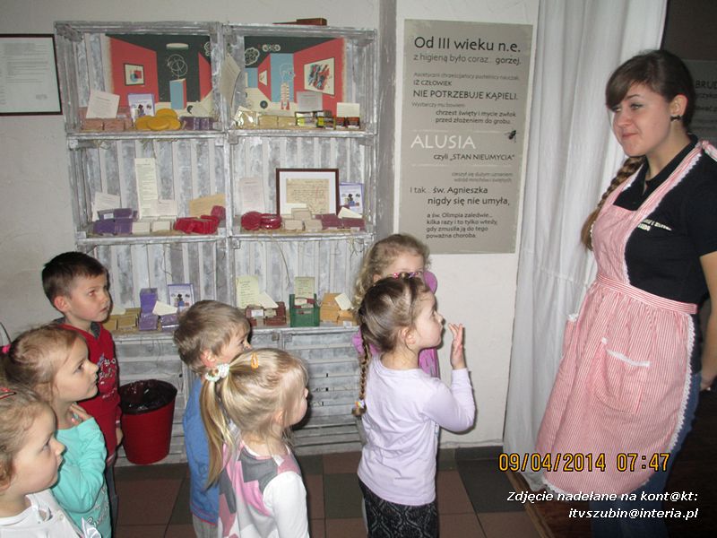 9 kwietnia 2014 r. dzieci z grupy ?Motylki? z Samorządowego Przedszkola nr 2 w Szubinie (oddział zamiejscowy w Rynarzewie) udały się do Muzeum Mydła i Historii Brudu w Bydgoszczy i przeniosły się w czasie do średniowiecznej łaźni. Dowiedziały się jak wyglądała higiena naszych babć oraz gdzie jest najwięcej bakterii. Motylki z uwagą słuchały ciekawostek jakie opowiadała pani przewodnik, oglądały przedmioty sprzed wielu lat i uczyły się prać na tarze. Najciekawsze dla naszych milusińskich okazały się warsztaty mydlarskie, w których wzięły udział. Dzieci miały okazję wytwarzać mydełka według własnej inwencji twórczej. Samodzielnie wybierały kolor, kształt, zapach a nawet dodatki jakie znalazły się w mydle. Na pamiątkę wizyty w muzeum dzieci otrzymały własnoręcznie wykonane mydełka. To była bardzo ciekawa wycieczka!.