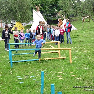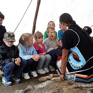 W ubiegłym tygodniu 5- i 6- latki z oddziałów przedszkolnych w Turze wybrały się na wycieczkę do wioski indiańskiej na obrzeżach Bydgoszczy. Już na parkingu czekał na nas Indianin, który przywitał nas tradycyjnym, indiańskim okrzykiem. Każdej grupie nadano nowe imię. Na trzy godziny sześciolatki stały się ,,Dzikimi końmi?, a pięciolatki ,,Sprytnymi lisami?. Podczas pobytu w wiosce dowiedzieliśmy się o zwyczajach i tradycjach panujących wśród Indian, zwiedzaliśmy różne namioty (tipi), oglądaliśmy wierne repliki strojów indiańskich wykonane z tysięcy koralików: koszule wojenne, tomahawki, torby z surowej skóry, słuchaliśmy indiańskiej muzyki, braliśmy udział w przeciąganiu liny, strzelaliśmy z łuku, pokonywaliśmy indiański tor przeszkód , polowaliśmy na fretki, jeździliśmy trójkami na drewnianych nartach. Atrakcją były przejażdżki na koniu i kucyku. Na zakończenie zjedliśmy kiełbaskę pieczoną nad indiańskim ogniskiem, która przez to jakoś lepiej nam wszystkim smakowała.