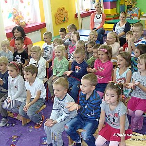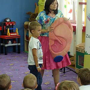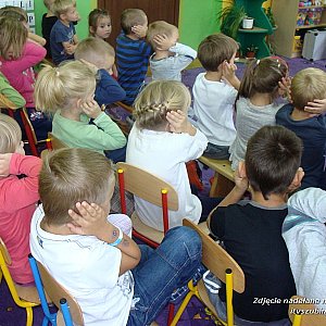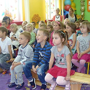 Już po raz drugi w tym miesiącu Przedszkole Niepubliczne ?Słoneczko? w Szubinie odwiedziło kreatywne studio Okrzyk Radości. Tym razem zaproszeni goście zaprezentowali program pt. ?Kiedy zamiast ucha słucha oko ? audycja z językiem migowym?. Zajęcia przeznaczone były dla starszych grup przedszkolnych ?Żabek? oraz ?Zuchów?. Dzieci zaznajomiły się z budową narządu słuchu, dowiedziały się jak należy o niego dbać oraz miały okazję nauczyć się kilku krótkich słów i zwrotów w języku migowym. Milusińscy w dużym skupieniu i z wielkim zapałem starały się dokładnie odwzorować poszczególne gesty. Na końcu wszyscy razem zaśpiewali piosenkę używając przy tym poznanych wcześniej zwrotów migowych.