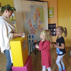 28 września 2015 r. "Pszczółki" z Przedszkola Niepublicznego "Słoneczko" w Szubinie miały okazję zwiedzić "palcem po mapie" słoneczną Grecję. Podczas tej podróży mieliśmy okazję dowiedzieć się wielu ciekawych rzeczy o tym pełnym historii kraju. Poznaliśmy najciekawsze zabytki i wyspy. Wiemy, że stolicą Grecji są Ateny. Mieliśmy okazję skosztować greckiej kuchni, która nie wszystkim przypadła do gustu. Braliśmy udział w olimpiadzie sportowej na Olimpie. Konkurencje były niełatwe, zwycięzcy zostali nagrodzeni wieńcem laurowym. Tańczyliśmy też grecki taniec, tj. "Zorba". Na koniec dekorowaliśmy antyczne wazy. To była niesamowita przygoda, którą będziemy długo wspominać.