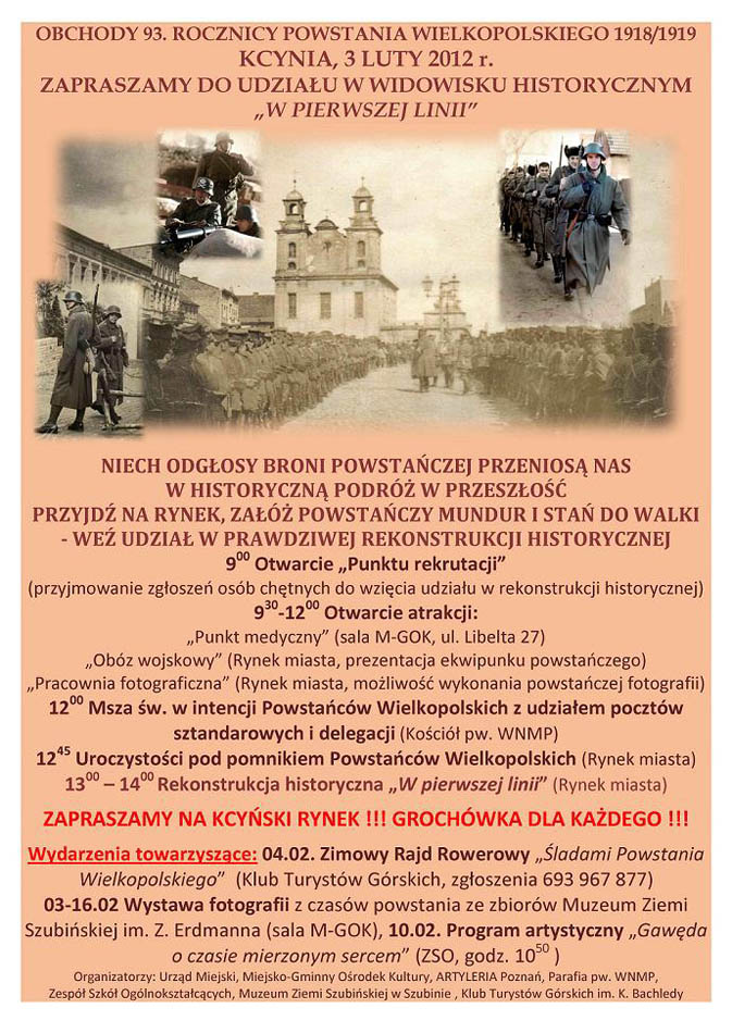 Bardzo ciekawie zapowiadają się uroczystości związane z obchodami 93. rocznicy Powstania Wielkopolskiego, które odbędą się w Kcyni. Do najbardziej widowiskowych wydarzeń tego dnia możemy niewątpliwie zaliczyć na rekonstrukcję historyczną historycznej "W pierwszej linii" odwzorowującej przejęcie kcyńskiego dworca w noc sylwestrową.