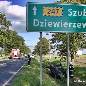 W środę, 24 sierpnia 2016 r. około godziny 17:00 doszło do kolizji dwóch samochodów osobowych na drodze wojewódzkiej 247. Jadąca w kierunku Kcyni kobieta wykonywała manewr wyprzedzania wjeżdżając na skrzyżowanie do Dziewierzewa. W tej samej chwili do ruchu włączał się ford fokus, którego kierowca chciał jechać w stronę Bydgoszczy. Z lewej miał wolne, więc ruszył ale niestety na jego pasie ruchu znalazł się wykonujący manewr wyprzedzania VW polo. Oba auta zostały rozbite, a ?polówka? wylądowała na dachu w rowie wypełnionym wodą. Na szczęście kierowcy forda nic się nie stało, a kobieta mimo dachowania wyszła także z lekkimi potłuczeniami. Na miejscu pracowali strażacy, ratownicy medyczni i policjanci z Kcyni, Nakła i Szubina. 37-latek kierujący Fordem za spowodowanie kolizji został ukarany mandatem. Policjanci ukarali mandatem także kierującą VW Polo, 58-letnią bydgoszczankę za wyprzedzanie w miejscu niedozwolonym.