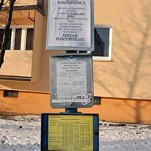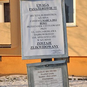 Uwaga pasażerowie decyzją Burmistrza Szubina z dniem 1 marca 2012 roku, przystanek usytuowany przy ul. Gen. Jarosława Dąbrowskiego (oś. Spółdzielcze) w Szubinie zostaje zlikwidowany - podpisano Przedsiębiorstwo Komunikacji Samochodowej w Bydgoszczy.
