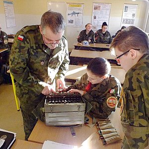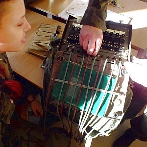 Tym razem młodzieży w mundurach zostały zaprezentowane podstawowe urządzenia pozwalające zbudować lokalną sieć telefoniczną na terenie szkoły i nie tylko chociażby w sytuacji, gdy ogólnodostępne i stosowane komórki odmówią posłuszeństwa. Wykorzystując centralę typu ŁP 10 MR (cywilne oznaczenia P-193B) uczniowie korzystając ze zwijaka wraz z bębnem kabla PKL 2 (polowy kabel liniowy dwużyłowy) zestawili łączność tj. podłączyli kilka telefonów polowych różnej generacji (między innymi TAJ-43MR, TAP-61, TA-57, MB-66, AP-48 i AP-82). Praktyczne realizowanie połączeń pozwoliło młodzieży klasy wojskowej poznać sposoby wykonywania połączeń między abonentami podłączonymi do centrali (okólnik, bezpośrednie połączenie pomiędzy abonentami oraz połączenie odbiorców z jednoczesnym prowadzeniem podsłuch) i nie będzie stanowiło dla nich problemu. Bardzo ważnym zadaniem dla abonentów podłączonych do polowego systemu łączności przewodowej dbali o przestrzeganie tajemnicy korespondencji. Dla większości szkolonych jedynym dotychczas aparatem, jaki znali była komórka oraz ewentualnie stacjonarny aparat telefoniczny znajdujący się w domu. Podczas planowanych dobowych taktycznych zajęć w dniach 09-10.12.br. ze szkolenia z łączności radiowej kadeci z IITL będą mieli okazję zapoznać się z przepisami prowadzenia korespondencji przewodowej, jak i radiowej przez techniczne środki łączności oraz praktyczne nawiązywanie łączności w obszarze leśnym na ?Wesółce?. Dziękujemy mjr. Błasiakowi za przybycie, poświęcony czas oraz profesjonalną realizację niezwykle ciekawych zajęć.