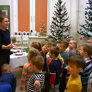 Dzieci z grupy ,, Pszczółki?? z Samorządowego Przedszkola nr 2 w Szubinie uczestniczyły w zajęciach w Muzeum Ziemi Szubińskiej. Celem spotkania było poznanie tradycji Świąt Bożego Narodzenia. Dzieci mogły obejrzeć rekwizyty tj. szopka, choinka , jak wyglądał dawniej stół wigilijny i jakie potrawy spożywano podczas wieczerzy wigilijnej . Dzieci obejrzały także film jak robi się bombki choinkowe. Po obejrzeniu filmu dzieci z zapałem wykonywały ozdoby na choinkę. Serdecznie dziękujemy za wspaniałe zajęcia.