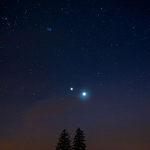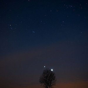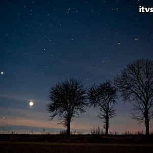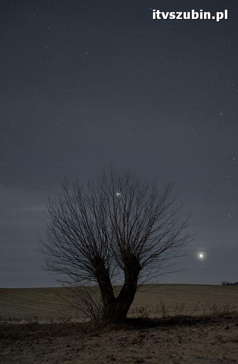 Druga połowa marca to okres znakomitej widoczności planet. Krótko po zmierzchu nad zachodnim widnokręgiem widoczne są dwie najjaśniejsze obecnie planety na naszym niebie: Wenus i Jowisz. Przez cały tydzień planety będą blisko siebie. Planet nie sposób pomylić ze sobą, ponieważ Wenus świeci około 8 razy jaśniej od Jowisza, a ten z kolei prawie dwa razy jaśniej niż najjaśniejsza gwiazda nocnego nieba Syriusz. Obie planety zachodzą po godzinie 22. Warto spojrzec w tych dniach na niebo, bo jest to olśniewający widok. Równocześnie z Wenus i Jowiszem można obserwować Marsa, który godzinę po zachodzie Słońca jest już ponad 20° nad wschodnim widnokręgiem. Latwo go odróżnić od gwiazd, ponieważ wyróżnia się czerwona barwą. Prawie 5 godzin po Marsie wschodzi Saturn znajdujący się aktualnie w konstelacji Panny. Dwie godziny po zachodzie Słońca można też spróbować zaobserwować światło zodiakalne, które wygląda jak słaba poświata w kształcie stożka nad zachodnim horyzontem. Światło zodiakalne to światło słoneczne odbite od cząstek pyłu kosmicznego. Do jego obserwacji potrzebne jest jednak bardzo ciemne i czyste niebo.