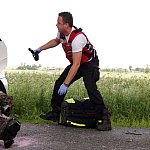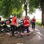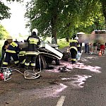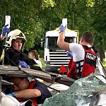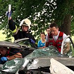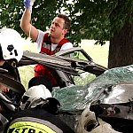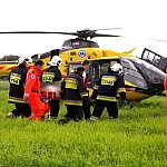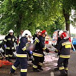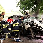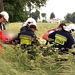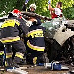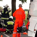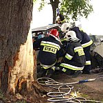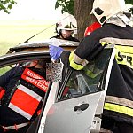 10 czerwca 2013 r. około godziny 15.45 kcyńskie służby ratunkowe zostały postawione w stan alarmowy. Na drodze wojewódzkiej 247 na wysokości miejscowości Głogowiniec doszło do wypadku drogowego. Prawdopodobnie samochód osobowy marki FORD FOCUS, jadący w kierunku Poznania, podczas manewru wyprzedzania samochodu ciężarowego z naczepą, zjechał z lewej krawędzi jezdni i uderzył w drzewo. Wszystko działo się na moich oczach, fokus wyprzedził mnie i po chwili uderzył w drzewo. Silnik wyskoczył z samochodu, a auto zostało mocno rozbite. - relacjonował zdarzenie naszej redakcji kierowca wyprzedzanej ciężarówki. Kierowca tzw. Tira wraz z innym kierowcą wezwali pomoc i sami próbowali wydostać z rozbitego auta pasażera, który jak później się okazało miał przygniecione nogi. Na miejscu zdarzenia pracowali ratownicy medyczni i strażacy z Kcyni. Po chwili dojechał zastęp z Jednostki Ratowniczo-Gaśniczej nr 2 w Szubinie oraz druga karetka z Szubina. Akcja należała do trudnych, gdyż sytuacja jaką zastali ratownicy wymagała użycia profesjonalnego sprzętu pneumatycznego do wycinania stali i metalu. W czasie gdy strażacy wycinali drzwi i konstrukcję auta, ratownicy medyczni wewnątrz i na zewnątrz rozbitego samochodu udzielali pomocy pasażerowi. Przebieg akcji mimo bardzo szybkiego tempa i odważnych decyzji wymagał czasu. Strażacy do wydostania poszkodowanej osoby musieli użyć rozpieraka pneumatycznego, który skutecznie rozszerzył zmiażdżoną konstrukcję pojazdu. Strażacy z kcyńskiej ochotniczej straży znakomicie współpracowali z ratownikami medycznymi, pomagali im podawać leki poprzez kroplówki oraz tlen. Poszkodowanego do szpitala w Bydgoszczy przetransportowało Lotnicze Pogotowie z Bydgoszczy. W całym zdarzeniu kierowca rozbitego samochodu osobowego nie odniósł większych obrażeń. Przy wypadku od pierwszych chwil pracowali także policjanci z komisariatu Policji w Kcyni, którzy zostali wsparci technikami kryminalistyki z Komendy Powiatowej Policji w Nakle nad Notecią.