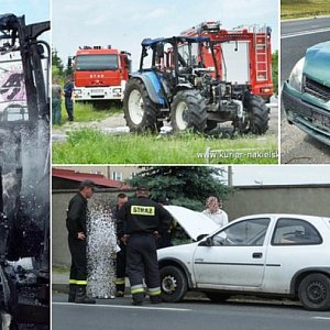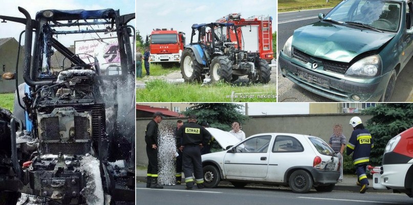 28 czerwca 2017 roku około godz. 12:00 na stanowisko kierowania Komendy Powiatowej PSP w Nakle nad Notecią wpłynęło zgłoszenie o pożarze ciągnika rolniczego na krajowej "10" pomiędzy Lubaszczem, a Śmielinem. Na miejsce zadysponowano zastęp z Jednostki Ratowniczo-Gaśniczej nr 1 w Nakle nad Notecią i zastęp OSP Sadki. Na miejscu zastano stojący w ogniu ciągnik rolniczy marki New Holland. Natychmiast przystąpiono do działań gaśniczych. Wcześniej jak pojawił się ogień zdołano odczepić przyczepę z balotami siana. W innym przypadku mogła ulec także spaleniu przyczepa z balotami. Na miejsce przybył patrol Policji. O godz. 13:10 na ul. Nakielskiej w Mroczy doszło do kolizji dwóch samochodów osobowych. Kierująca samochodem osobowym marki Opel Corsa z centru miasta zatrzymała się sygnalizując kierunkowskazem skręt na stację paliw. Jadący za oplem, samochodem osobowym marki Renault Thalia zagapił się i uderzył w stojący samochód. Na szczęście nikomu nic się nie stało. Na miejsce kolizji przybył zastęp z Jednostki Ratowniczo-Gaśniczej nr 1 w Nakle nad Notecią, zastęp z OSP Mrocza, Zespół Ratownictwa Medycznego z Mroczy i Policja.