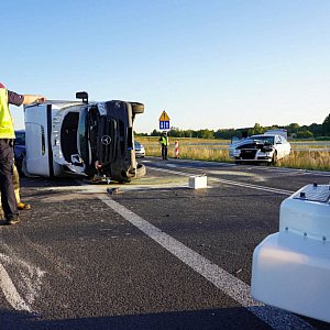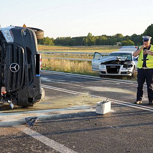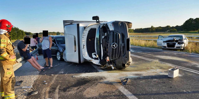 Zderzyły się dwa samochody osobowe oraz ciężarówka marki mercedes, która dodatkowo przewróciła się na bok blokując jezdnię, Na szczęście nic poważnego jadącym w pojazdach osobom się nie stało. Jedna z nich uskarżała się na ból w barku.