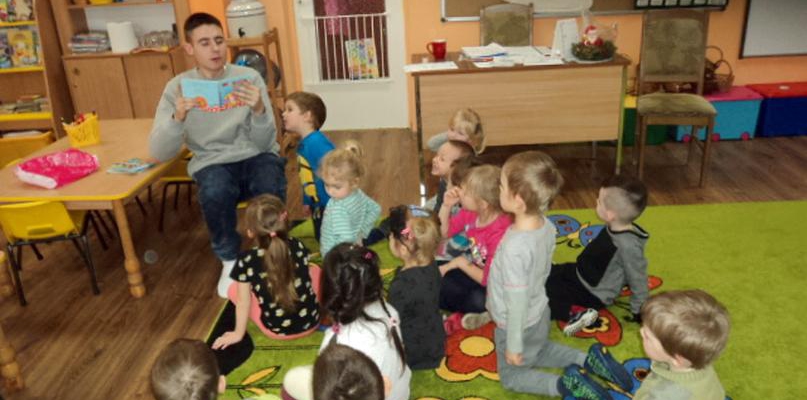 W ramach akcji "Cała Polska czyta dzieciom" do popołudniowej grupy Słoneczek przychodzi czytać bajki starszy kolega Artur Wrzesień. Artur jest absolwentem naszego przedszkola i z wielką ochotą i odpowiednią intonacją przekazuje dzieciom wartościowe treści. Czytanie przez niego bajek jest już rytuałem dnia codziennego. Dzieci z wielką radością oczekują na Artura, a podczas słuchanego tekstu, oblegają starszego kolegę zaglądając mu do książki. W głowie malutkich dzieci powstają różne obrazy: od kury na grzędzie, niosącej złote jajka po niekończące się opowieści o Piotrusiu Panu. Niejasne i nowe wydarzenia przekazane grupie Słoneczek stają sie być dla nich znajome i zrozumiałe. Bajki kształcą w nich wyobraźnię, poszerzają zasób słownictwa i wykazują niezmiernie istotny wpływ na rozwój ich umysłu i osobowości. Jednocześnie wpływają na rozwój koncentracji uwagi, gdyż konieczne jest skupienie uwagi przez dłuższy czas na treści czytanego tekstu. Warto podkreślić przy tej okazji, że obraz telewizyjny, pełen ruchu, ciągłych zmian i silnych kolorów, wyzwala uwagę mimowolną. Książka wymaga koncentracji nie na formie, a na sensie słów, w sposób zamierzony. Artur poprzez czytanie, zachęca dzieci do samodzielnego sięgania po książkę, rozbudzając zainteresowania, a nie tylko do biernego ślęczenia przed telewizorem.