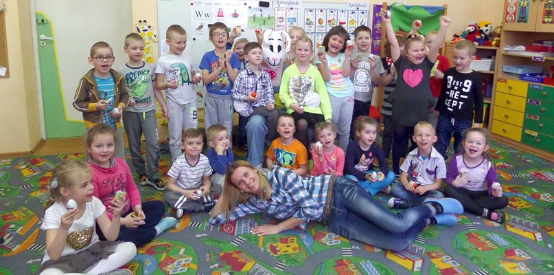 12 kwietnia 2017 r. Wioleta Danielek i Małgorzata Łuksztet przy współpracy z MOAS w Szubinie zorganizowały - Zabawę tropiącą pn. "Spotkanie z Wielkanocnym Zajączkiem". Zabawa i poszukiwania specjalnego gościa dnia – Zajączka miały się odbyć na terenie pobliskiego parku, jednak pogoda w tym dniu postanowiła spłatać psikusa i poszukiwania gościa musiały odbyć się na terenie przedszkola. Od samego ranka w przedszkolu można było napotkać na niecodzienne ślady – dzieci bardzo szybko rozwiązały zagadkę, że ślady te należą do Wielkanocnego Zajączka. Przedszkolaki po wyjściu ze swoich sal, np. do łazienki nie ukrywały radości z takiego widoku. Zajączek zapukał do każdej sali przedszkolnej odwiedzając kolejno: Wróbelki, Muchomorki, Stokrotki, Motylki, Biedronki i Skrzaty. Zajączek zaszczycił dzieci swą wizytą obdarowując ich słodkimi upominkami, które przygotował we współpracy z Radą Rodziców naszego przedszkola. Przedszkolaki nie pozostały dłużne i przygotowały dla naszego gościa piękne laurki oraz zaśpiewały piosenki o zajączku i Świętach Wielkanocnych życząc przy tej pięknej okazji Zajączkowi wiele sił, i aby pamiętał o wszystkich dzieciach w tym roku oraz w roku następnym. Obiecały, że z utęsknieniem będą oczekiwały na kolejne spotkanie. Szczególne podziękowania dla p. Adama Kulczyka – wychowawcy MOAS oraz wychowanków za coroczną współpracę.