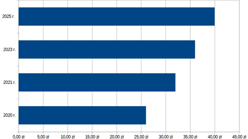 Wykres prezentuje stawki opłaty za gospodarowanie odpadami komunalnymi od 2020r. do 2025 r.